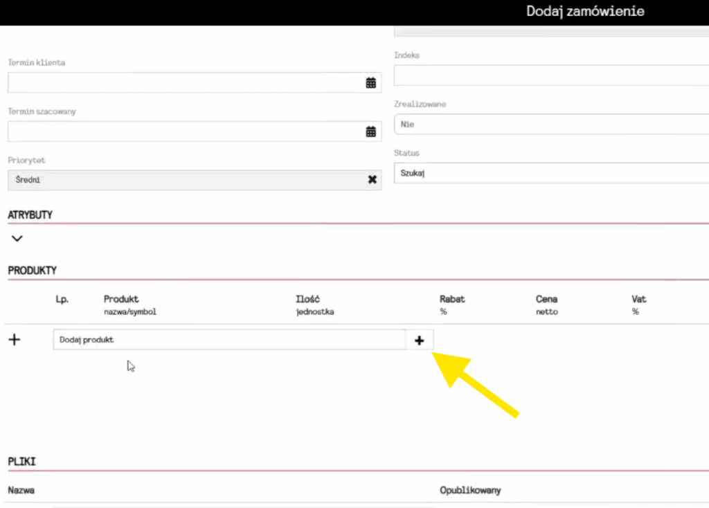 W nowej wersji zamówienia, podczas dodawania produktu, kliknij „+”, by przejść bezpośrednio do kreatora dodawania produktu – nie trzeba korzystać z osobnej sekcji przed wyborem.