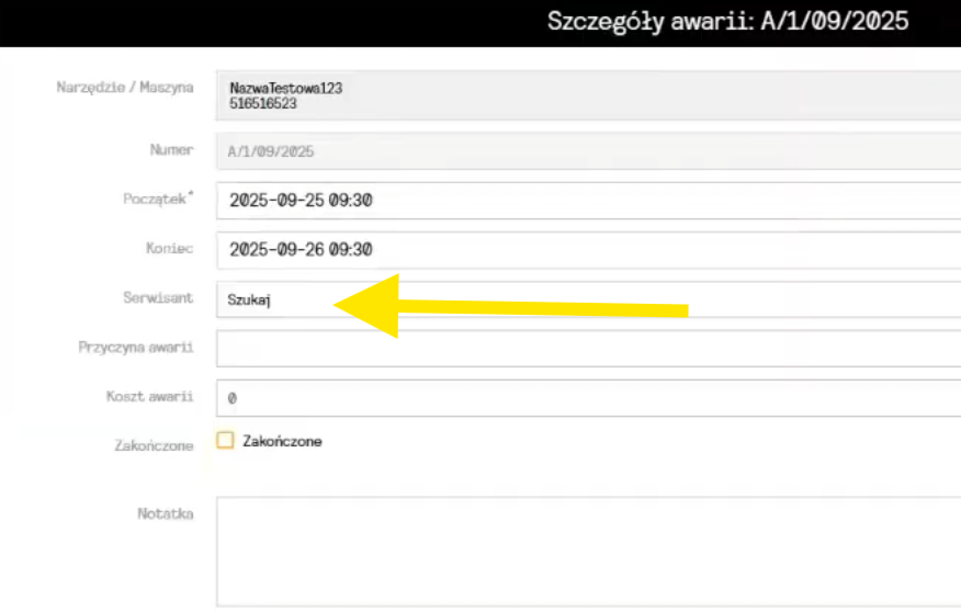 W sekcji „Utrzymanie ruchu -> Awarie” otwórz szczegóły dowolnej awarii – zobaczysz nowe pole „Serwisant”. Można tu wybrać osobę serwisującą awarię spośród dostępnych pracowników.