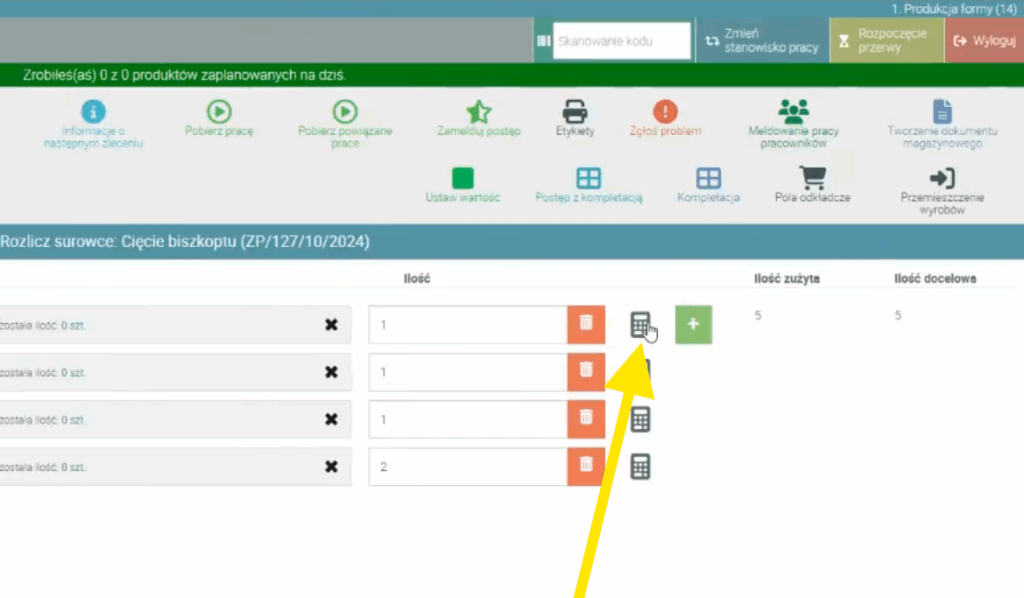 W panelu meldunkowym podczas rozliczania surowców dostępny jest kalkulator jednostek, umożliwiający przeliczanie ilości bezpośrednio w widoku meldunkowym. Z funkcji przelicznika jednostek skorzystasz przy rozliczaniu surowców i nowych pozycji w panelu.