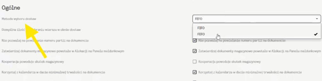 W „Ustawienia -> Magazyn -> Konfiguracja ogólna” wskazujesz sposób rozchodowania jako FEFO – ta opcja jest widoczna w konfiguracji wyboru dostaw dla magazynu (FIFO i FEFO).