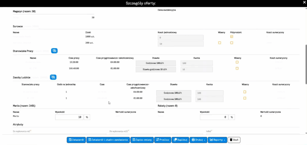 W “Sprzedaż -> Oferty” kliknij w szczegóły wybranej oferty, następnie „Przelicz”. Po rozwinięciu pozycji zobaczysz nowe dodatkowe pola, takie jak stawka lub kwota. Zmiana polega na uzupełnieniu widoku pozycji o dodatkowe parametry kosztowe.
