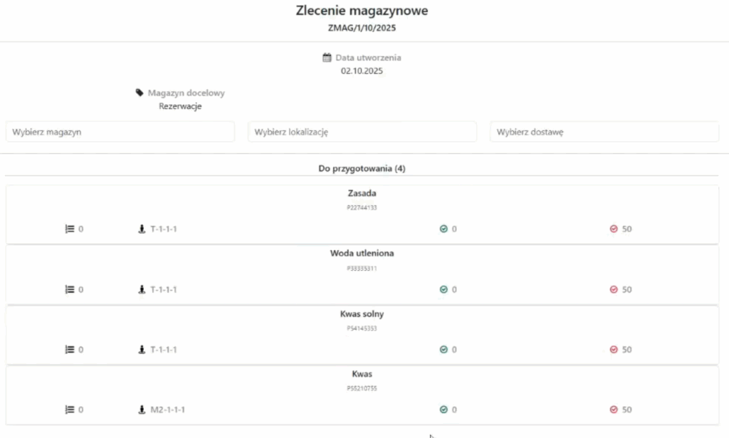 - Zlecenia magazynowe ze zleceń produkcyjnych.