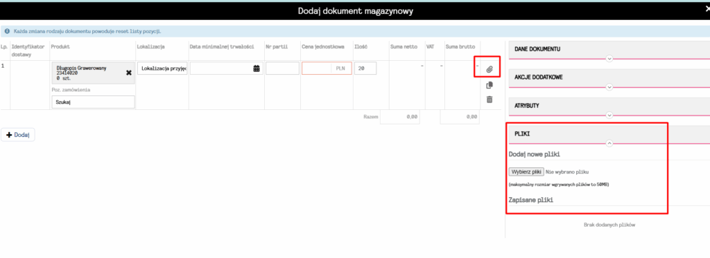 W ramach rozszerzenia systemu wprowadzono możliwość zarządzania plikami bezpośrednio z poziomu dokumentów magazynowych. W widoku szczegółów dokumentu dodano zakładkę „Pliki”, która umożliwia dodawanie, przeglądanie, pobieranie oraz usuwanie załączników powiązanych z dokumentem.