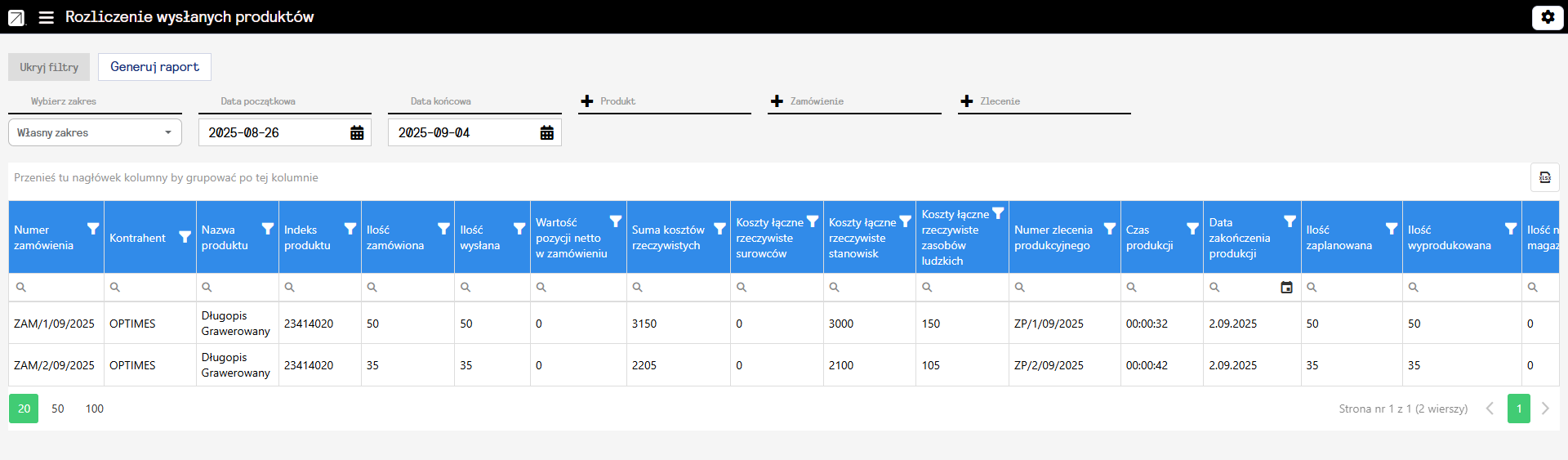 Raport Rozliczenie wysłanych produktów to narzędzie pozwalające szczegółowo przeanalizować proces realizacji zamówień i wysyłek w firmie. Zawiera informacje o zamówieniach, produktach, ilościach zamówionych, wysłanych i wyprodukowanych, a także o kosztach związanych z produkcją. Dzięki powiązaniu danych z meldunków produkcyjnych, dokumentów magazynowych i struktury surowcowej raport pokazuje zarówno wartość pozycji netto z zamówień, jak i faktyczne koszty produkcji oraz czas wytwarzania.