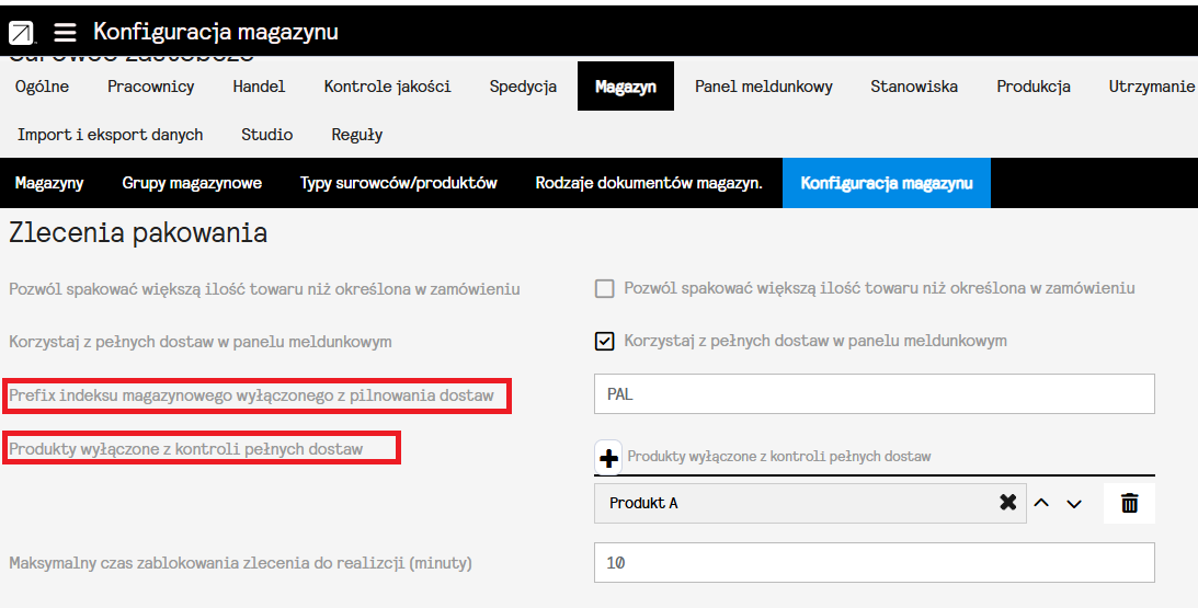 Służą do tego pola “Prefix indeksu magazynowego wyłączonego z pilnowania dostaw” oraz “Produkty wyłączone z kontroli pełnych dostaw”.