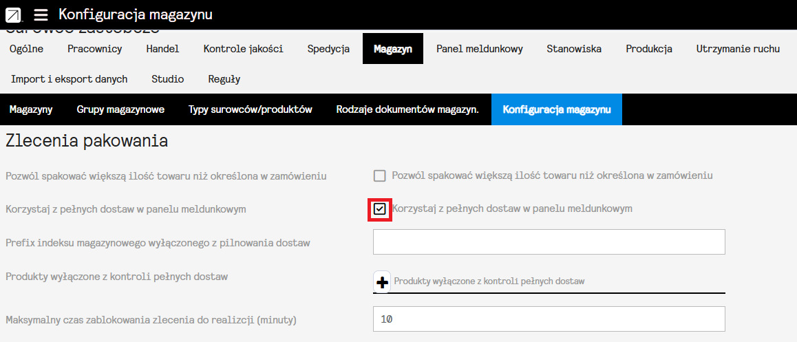 „Korzystaj z pełnych dostaw w panelu meldunkowym” – opcja ta sprawi, że system, z poziomu Panelu Meldunkowego, wymusi pakowanie tylko i wyłącznie pełnych dostaw w zleceniu, nie będzie możliwe ich rozdzielenie.