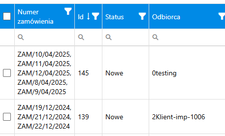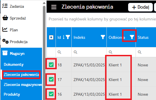 Jeśli mamy dodane wiele zleceń pakowania w encji Zlecenia Pakowania w sekcji Magazyn, możemy oznaczyć część bądź wszystkie zlecenia, które możemy zrealizować dla jednego klienta, do czego możemy użyć również filtrów w tabeli.