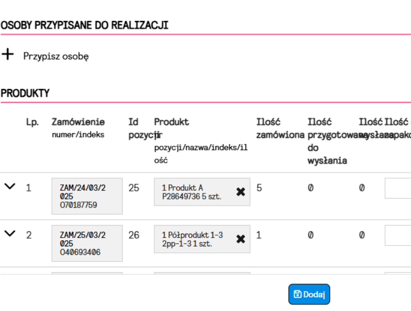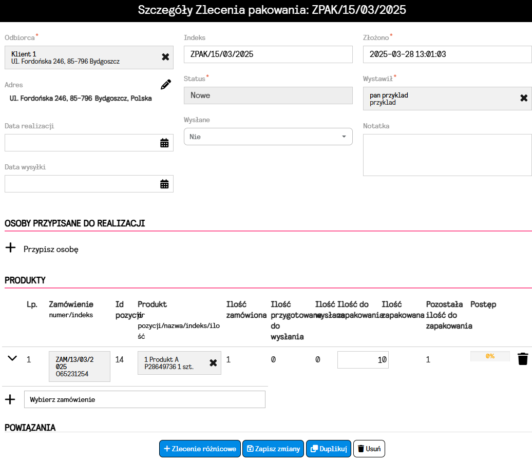 Jeśli zajdzie potrzeba wprowadzenia zmian, każde z tych zleceń możemy manualnie otworzyć i edytować bądź wystawić Zlecenie różnicowe, jak w przypadku tradycyjnego zlecenia pakowania.