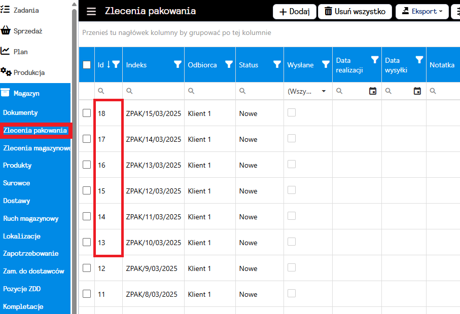 W ten sposób utworzone dokumenty kopiują wszystkie szczegóły zamówienia 1:1, nie będzie można ich na tym etapie edytować. Natychmiast pojawią się one na liście Zleceń pakowania pod sekcją magazyn, gdzie możemy je znaleźć po podanym wcześniej ID.