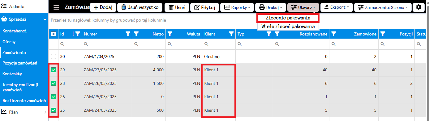 Gdy zlecenia pakowania są odpowiednio skonfigurowane, a mamy potrzebę wystawienia ich większej ilości bez zmian, w encji Zamówienia w sekcji Sprzedaż, możemy zaznaczyć wiele zamówień, które złożyli nasi klienci.