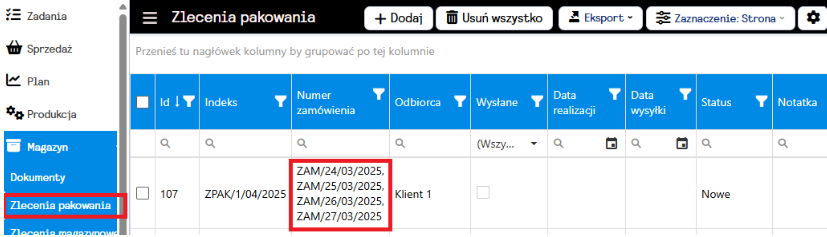 Z drugiej strony, możemy również stworzyć jedno zlecenie Pakowania dla wielu zamówień, jak długo dotyczą one jednego klienta.