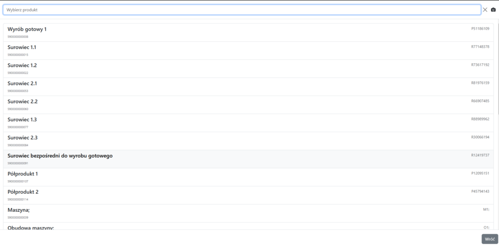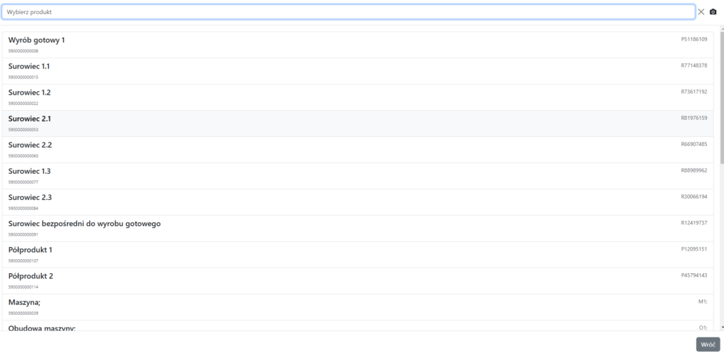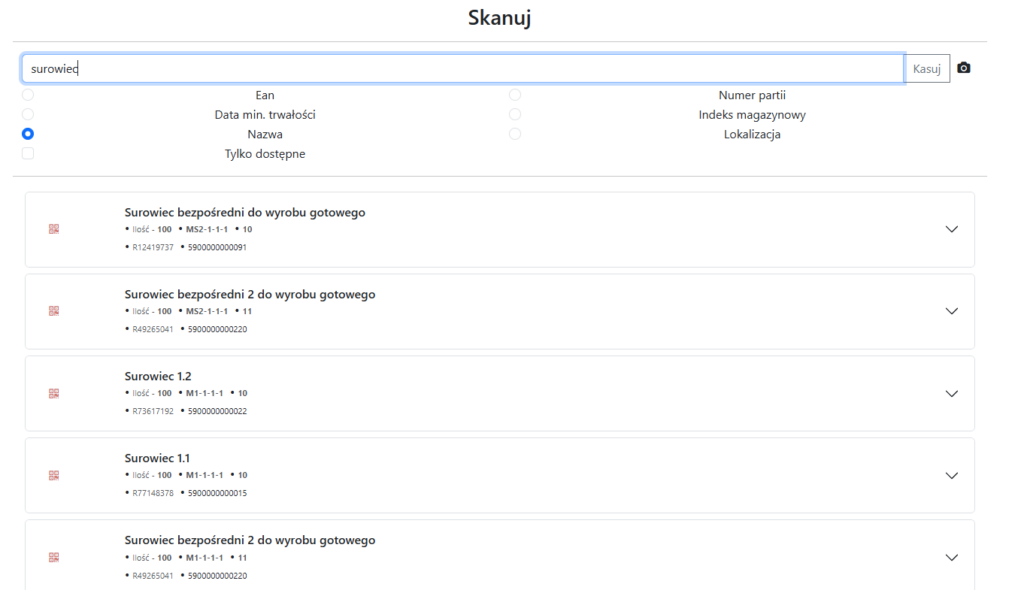 Klikamy go, i wybieramy surowce/towary, które mają zostać wprowadzone na stan magazynowy organizacji. Możemy również zeskanować indeks, nazwę, ean lub kod GS1 towaru i zostanie on wprowadzony.