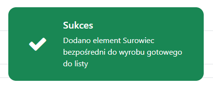 Każdorazowo po wybraniu surowca/materiału system zakomunikuje nam czy udało się dodać daną pozycję do dokumentu.