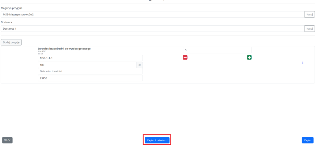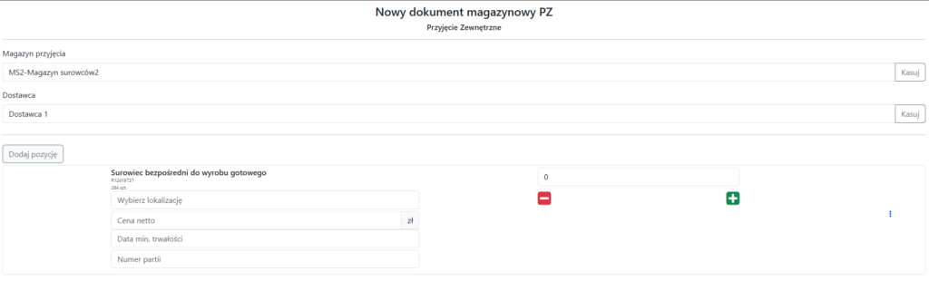 Teraz musimy podać ilość surowca, jaką wprowadzamy na magazyn, możemy również wskazać lokalizację, cenę netto jednej jednostki miary surowca/towaru, datę minimalnej trwałości oraz nr. partii.