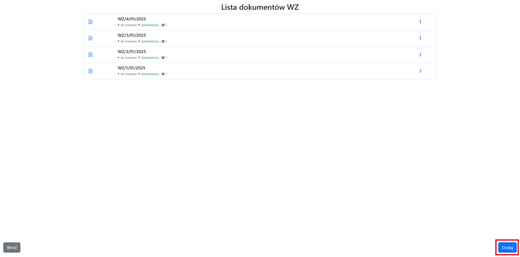 Aby wprowadzić nowy dokument, klikamy dodaj: