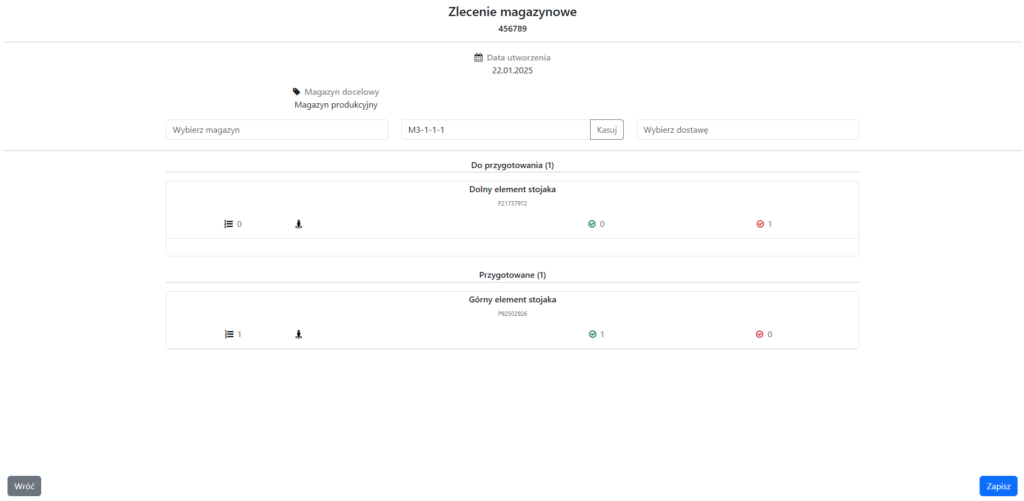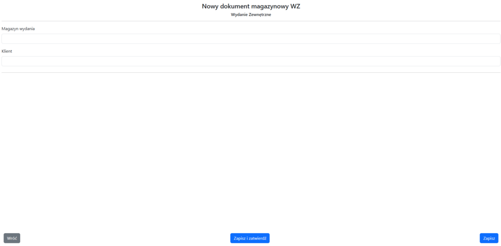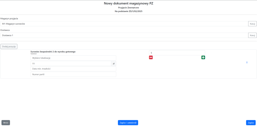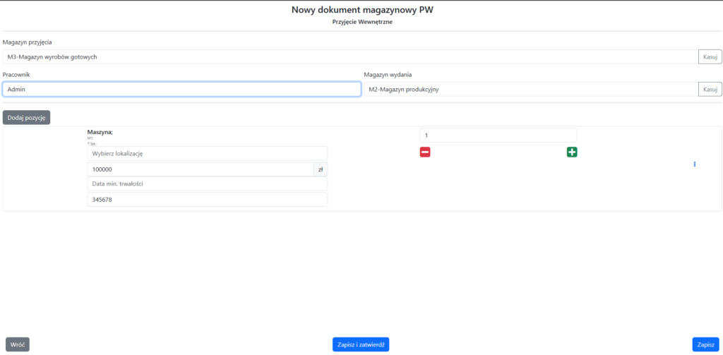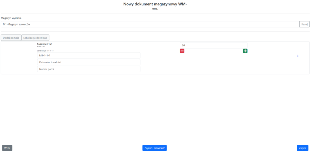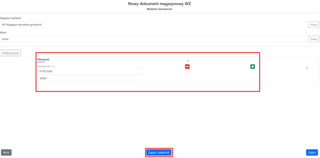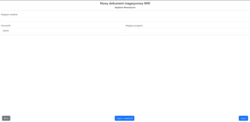 Zatwierdzenie i zapisanie dokumentu sprawi, że nie będzie on możliwy do edycji. Samo zapisanie, pozwoli na jego edycję z poziomu widoku “Dużego” systemu, jak i z poziomu panelu dla magazyniera.