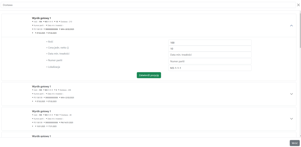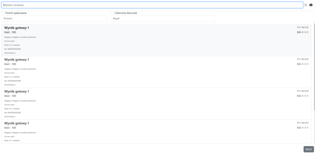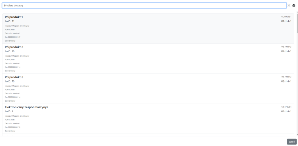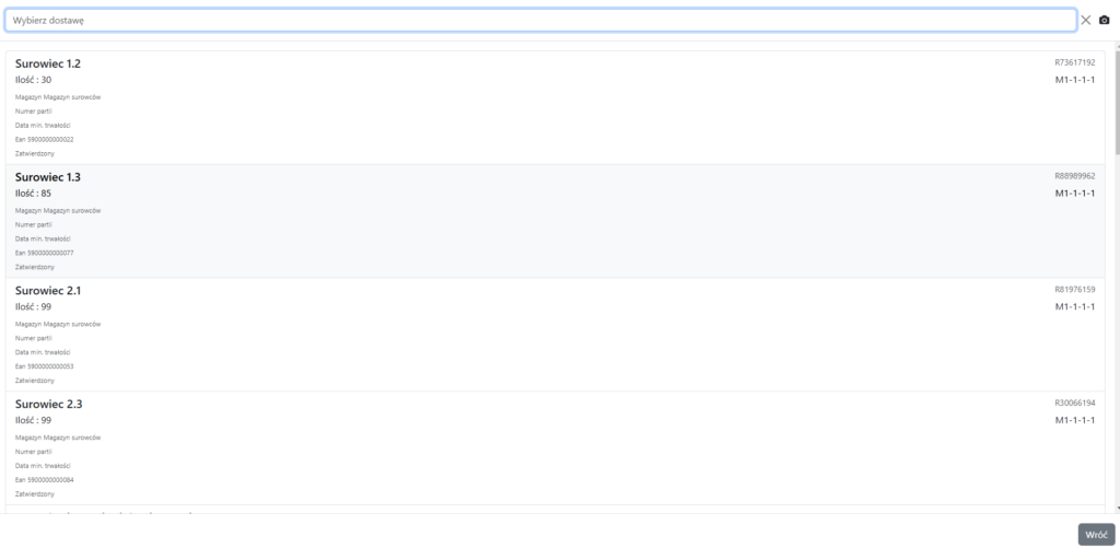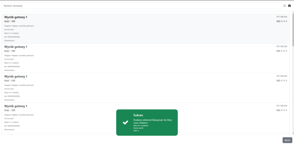 • skan numeru partii (jeśli będzie dokładnie 1 dostawa z tym numerem partii to ją wybierze do dokumentu, ale jeśli będzie więcej niż 1 to odfiltruje i pokaże wyniki na ekranie)