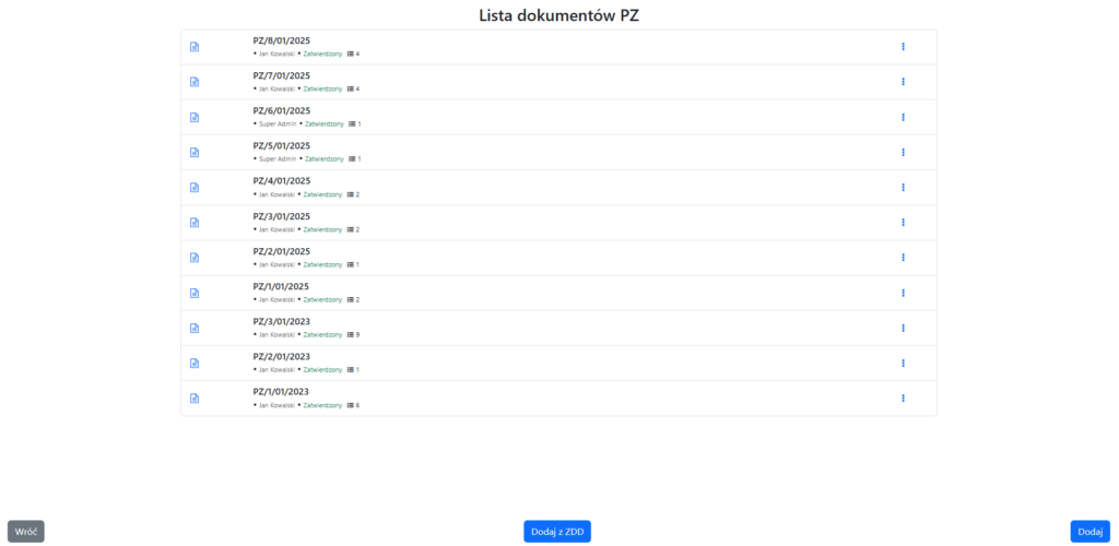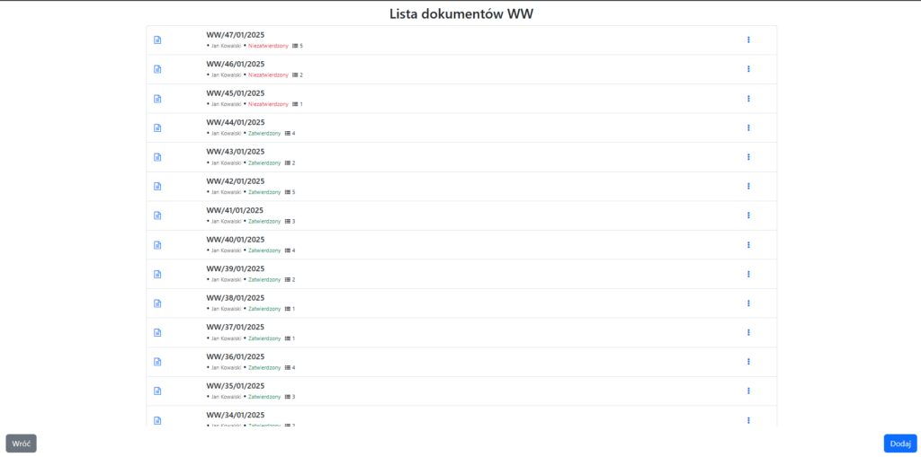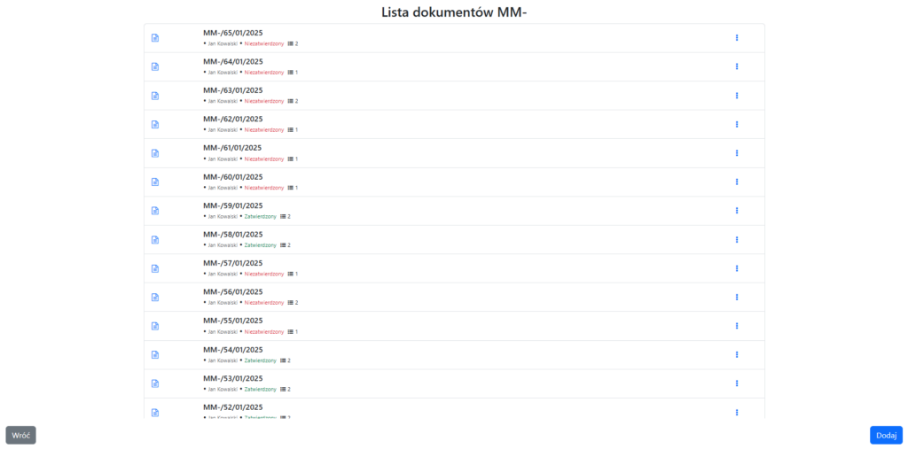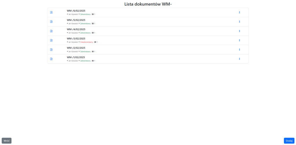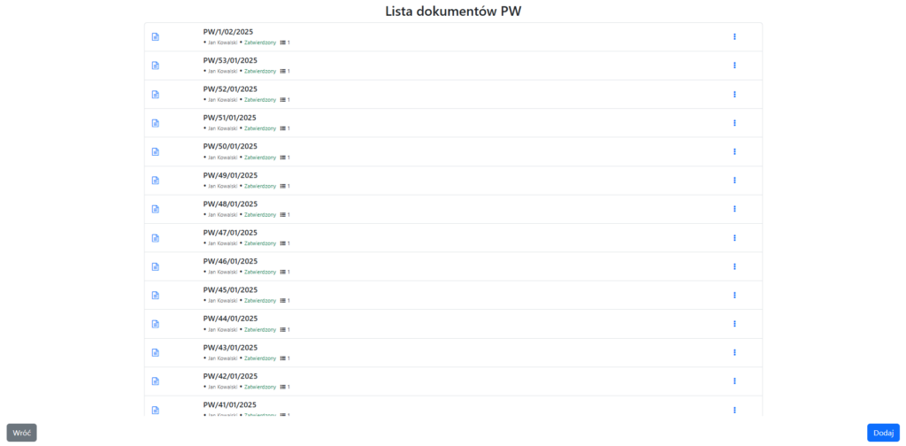 W tym widoku możemy zidentyfikować unikalny numer dokumentu, Imię i nazwisko osoby, która go wystawiła, a także ilość pozycji w dokumencie.