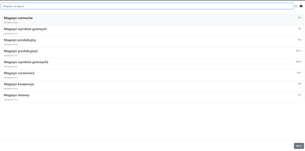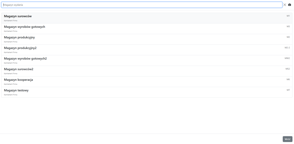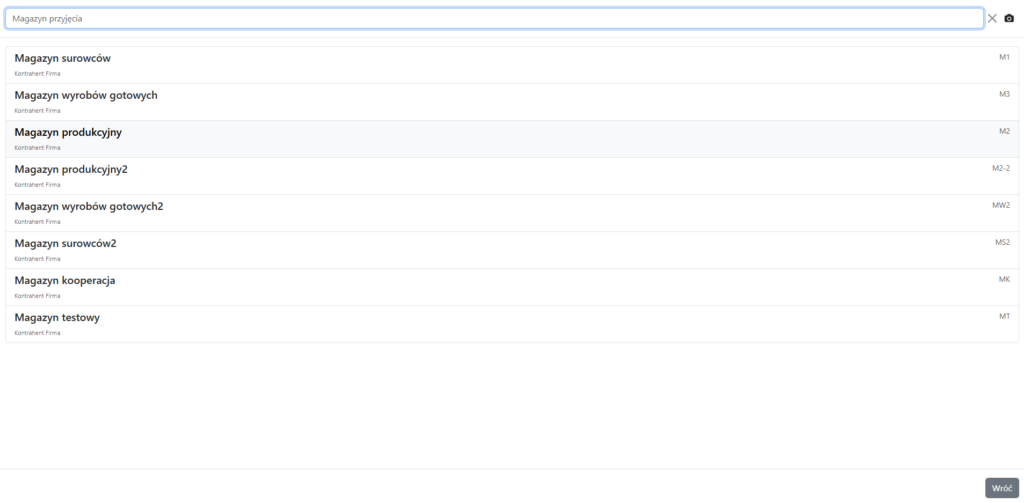 W tym miejscu musimy zdefiniować magazyn, na który chcemy przyjąć surowiec/towar oraz magazyn, z którego materiały zostaną pobrane. Dodatkową funkcjonalnością, jest możliwość zeskanowania dowolnej lokalizacji na którymś z magazynów, a system rozpozna go i wprowadzi.