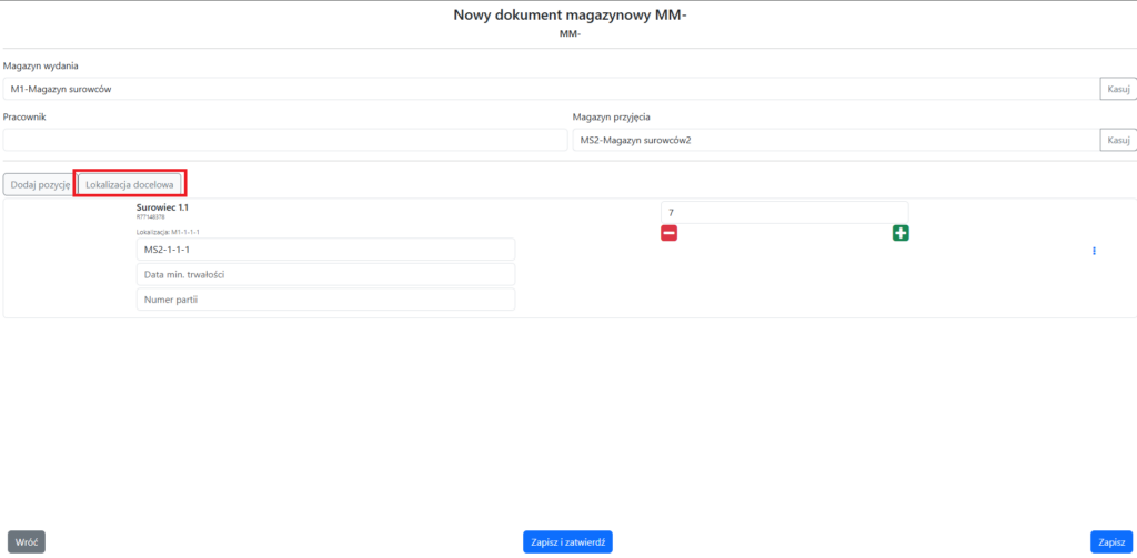 Następnie wskazujemy lokalizację, na którą chcemy przesunąć surowce/materiały w obrębie jednego magazynu: