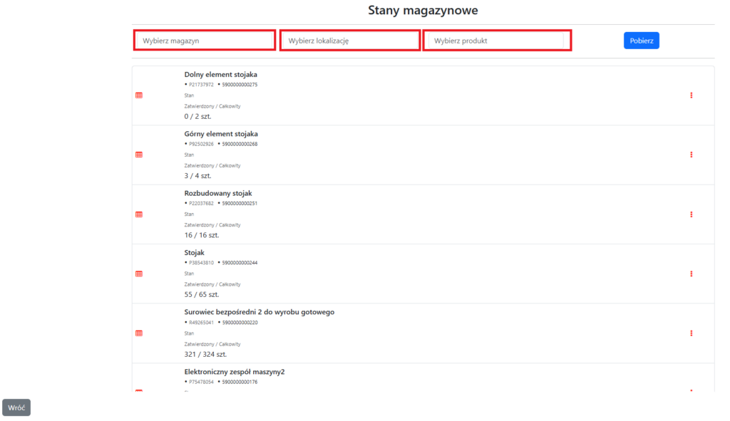 W szczegółowym widoku wybieramy magazyn, z którego chcemy pobrać dany surowiec/towar