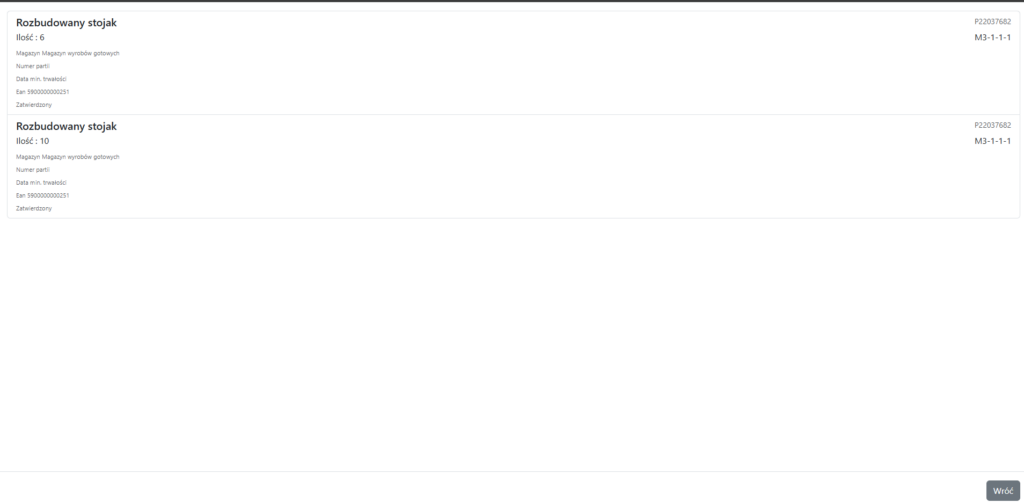 Jesteśmy zobligowani do wskazania magazynu, z którego chcemy pobrać towar, a także magazyn docelowy, następnie wybieramy surowce lub towary i ich ilości. Dodatkową funkcjonalnością, jest możliwość zeskanowania dowolnej lokalizacji na którymś z magazynów, a system rozpozna go i wprowadzi.