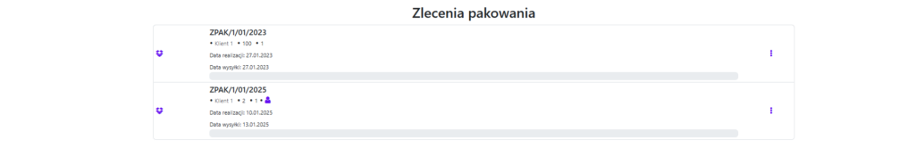 Po wejściu widzimy listę zleceń pakowania oraz dane dodatkowe takiej jak klient, data realizacji, data wysyłki czy też postęp.