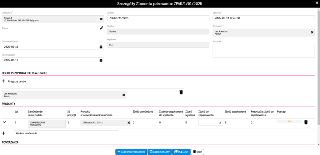 Jeżeli jeden z użytkowników pobierze zlecenie pakowania, to kolejny użytkownik będzie widział, kto je pobrał i nie będzie miał możliwości podjęcia i realizacji owego zlecenia.