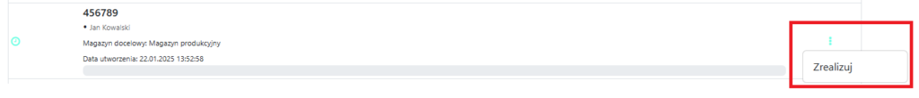 Z poziomu widoku ogólnego widzimy listę zadań, szczegóły oraz możliwości wyboru magazynu pobrania towaru czy też wybór dostawy pojawi się po kliknięciu pionowego wielokropka i kliknięciu realizuj