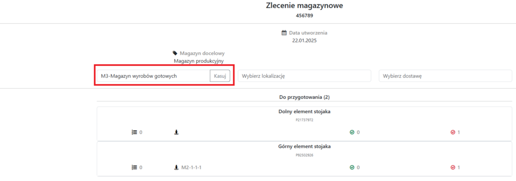 Widzimy tutaj dodatkowy przycisk “Lokalizacja docelowa”  – ustawia wszystkim wybranym dostawom jedną lokalizację docelową. Przydatne, kiedy chcemy przesunąć wiele towarów na jedną lokalizację np. BUFOR