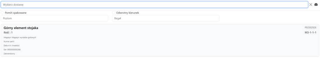 Funkcja  „Odwrotny kierunek” – przydane, jeśli fizycznie jesteś na końcu regału, i chcesz widzieć dostawy, które znajdują się na końcu regału. W przypadku, kiedy mamy np. regał A-1 do A-63, włączenie tej opcji posortuje dostawy towaru na te, które znajdują się na regale A-63, a następnie te, które są na A-1.
