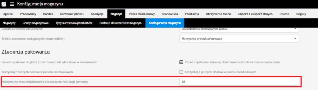 Jest to opcja przydatna w momencie, kiedy pracownik z różnych losowych względów może nie zda zlecenia w poprawny sposób (np. wyładuje się kolektor danych, będzie oddelegowany do innych prac). Parametr ustawiony na 10 minut spowoduje, że po tym czasie zlecenie pakowania będzie odblokowane i możliwe do realizacji przez inną osobę.