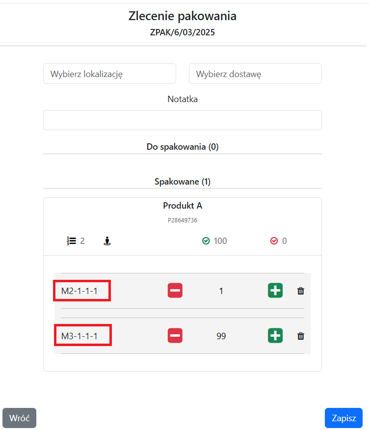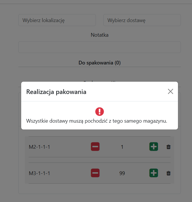 Jeśli do jednego zlecenia pakowania będziemy próbowali dodać produkty z różnych magazynów, pomimo pojawienia się ich na liście, system nie pozwoli nam zapisać takiego zlecenia.
