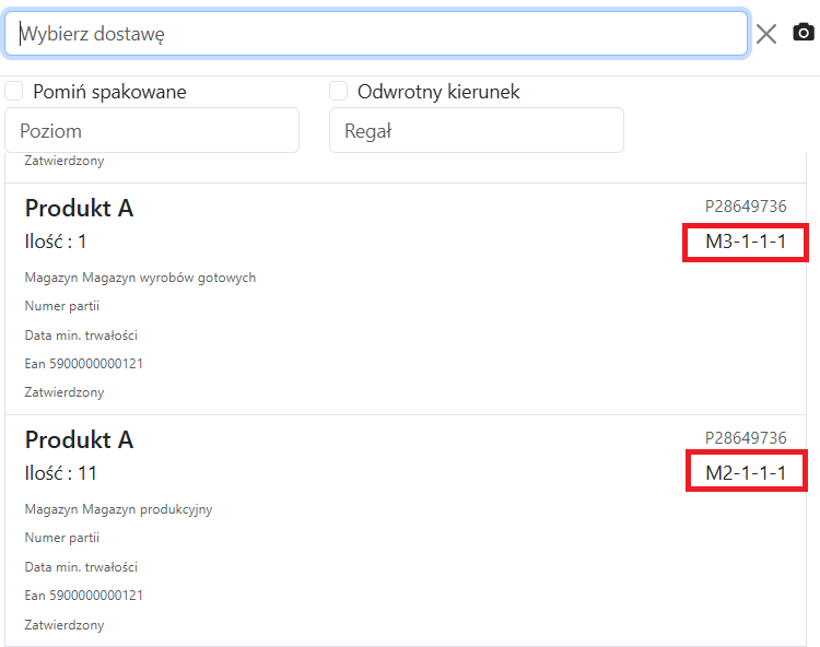 Teraz wyszukując dostawy, znajdziemy różne magazyny/lokalizacje, w których produkt jest dostępny