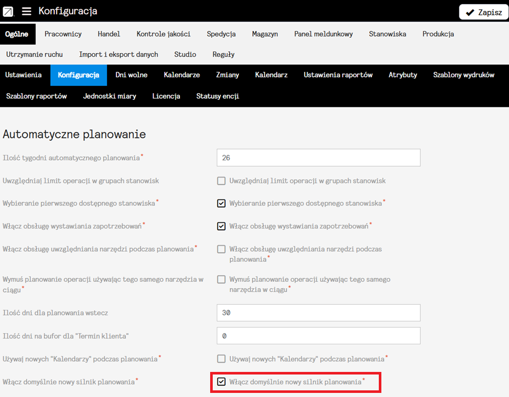 Możliwość konfiguracji Silnika planowania znajdziemy w Ustawieniach->Ogólne->Konfiguracja, w sekcji “Automatyczne planowanie”.