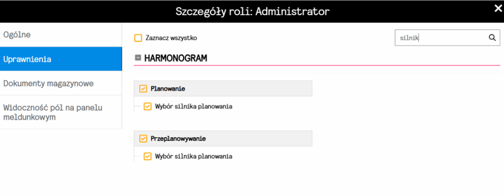 Wchodząc w Ustawienia->Pracownicy->Role, odnajdziemy dla sekcji Planowanie oraz Przeplanowanie uprawnienie “Wybór silnika planowania”