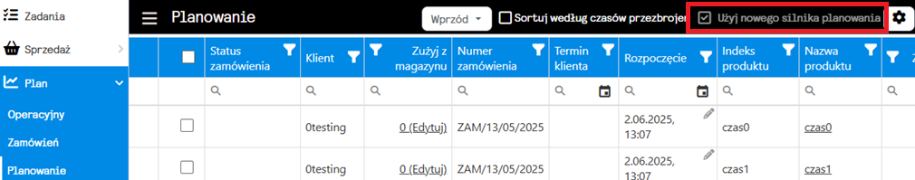Ustawienia te widzieć będziemy podczas planowania zleceń produkcyjnych, w prawym górnym rogu ekranu, zobaczymy zaznaczony checkbox “Użyj nowego silnika planowania”