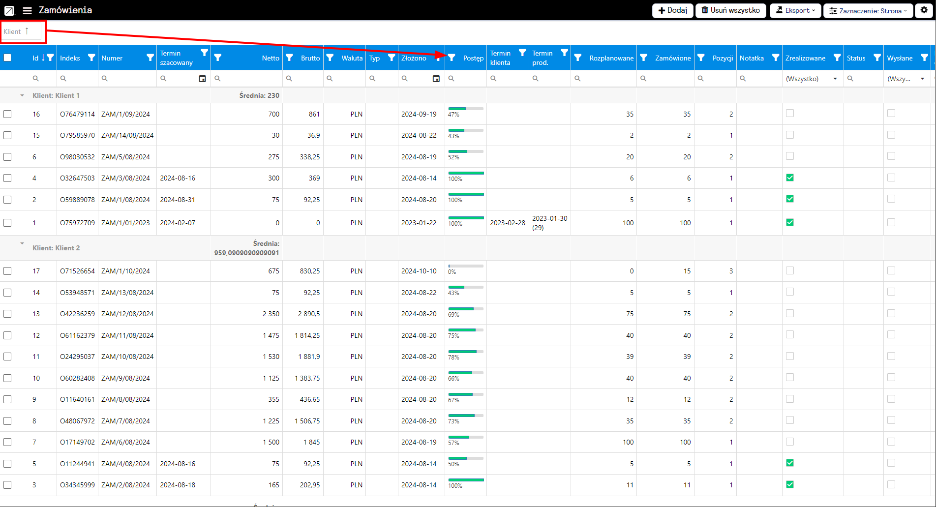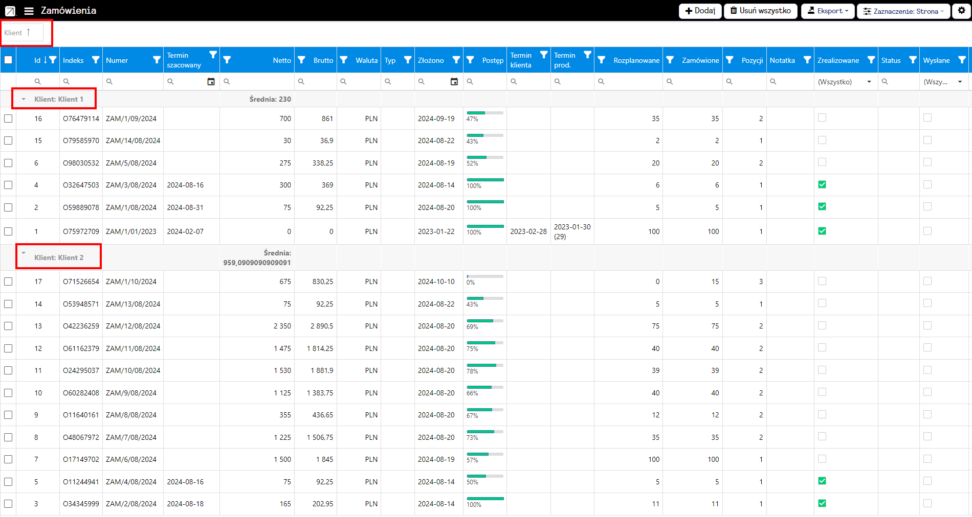 Po wykonaniu tej czynności lista zamówień zostanie podzielona na grupy zamówień powiązane z każdym z klientów: