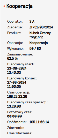 - Operacja – nazwa operacji technologicznej aktualnie wykonywanej na danym stanowisku