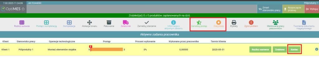 Pracownik może na panelu meldunkowym zgłosić wykonanie zadania wybierając: