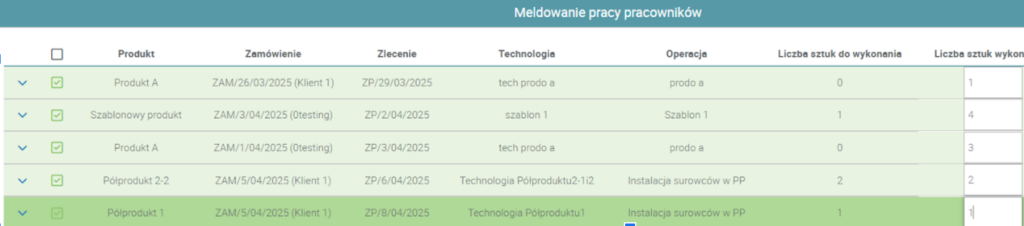 Należy również pamiętać, że jeśli mamy włączone Grupowe meldowanie pracy pracowników ta funkcja również będzie działała, więc brygadzista będzie w stanie tak samo kontrolować wydajność stanowisk, masowo raportując ich postępy – należy jednak pamiętać, że w tym widoku nie możemy rozliczać indywidualnie surowców.