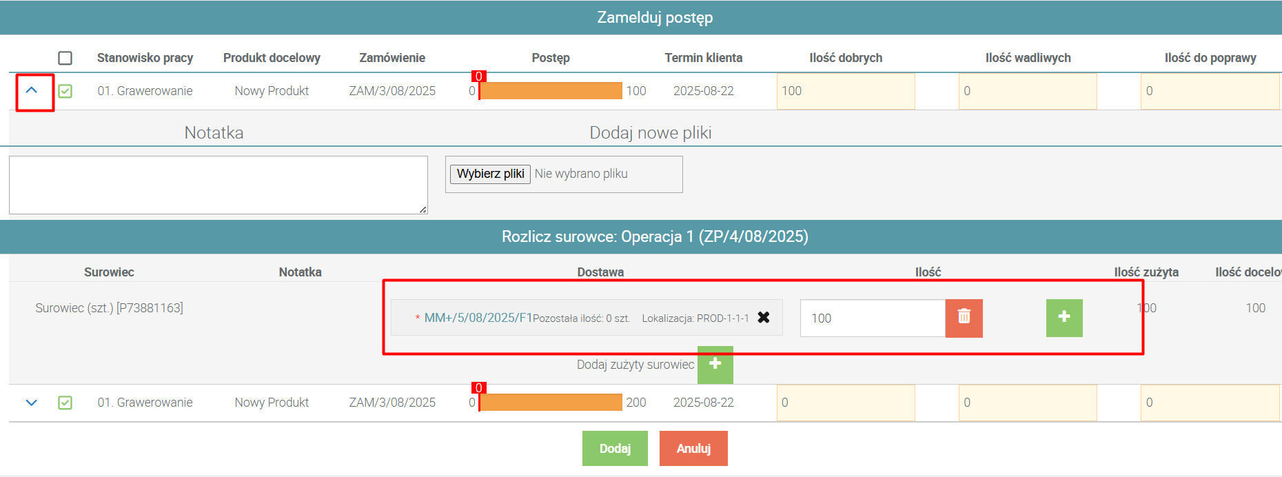 Jeżeli jest włączona funkcjonalność wskazywanie numerów partii zużytych materiałów, to po rozwinięciu wiersza zlecenia możemy wybrać dostawy zużytych surowców do obecnego meldunku postępu.