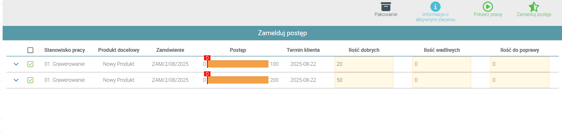 Pracownik produkcji ma obecnie możliwość meldowania postępu i zdawania pracy dla wielu operacji jednocześnie. Przyspiesza to proces samego meldowania i ogranicza ilość kliknięć w systemie.