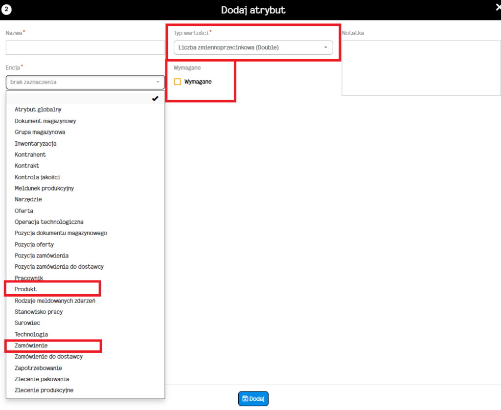 Najczęstszymi encjami, gdzie taki atrybut będzie wprowadzany, są Produkt oraz Zamówienie.