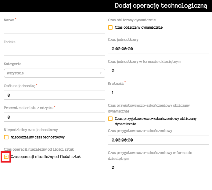 Odwrotną sytuacją, jest funkcja “Czas operacji niezależny od ilości sztuk” – jeżeli zaznaczymy tę opcję, wprowadzony przez nas czas operacji będzie zawsze stały, niezależnie od ilości wyrobów w zamówieniu, np. gdy cykl maszyny zawsze trwa określony czas