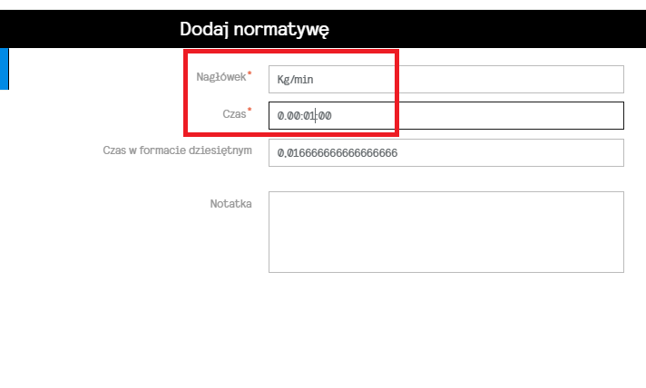 Normatyw służy do informowania systemu, jak długi czas ma policzyć dla danej operacji technologicznej w odpowiednich warunkach, czyli np. jeśli produkujemy 1 kg. produktu na minutę, ustawiamy czas na 1 min.