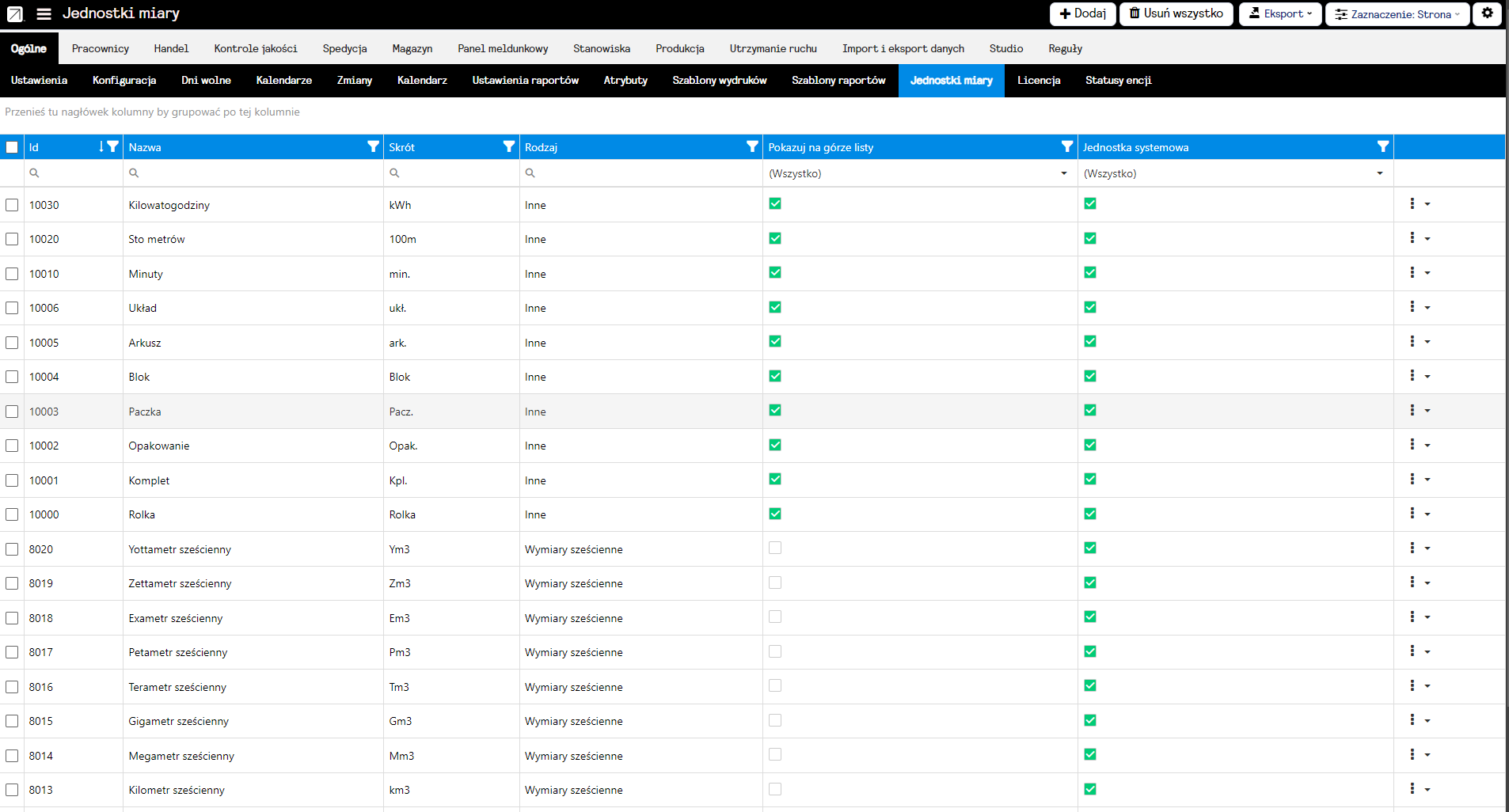W tym widoku zobaczysz listę wszystkich jednostek miary dostępnych w systemie.