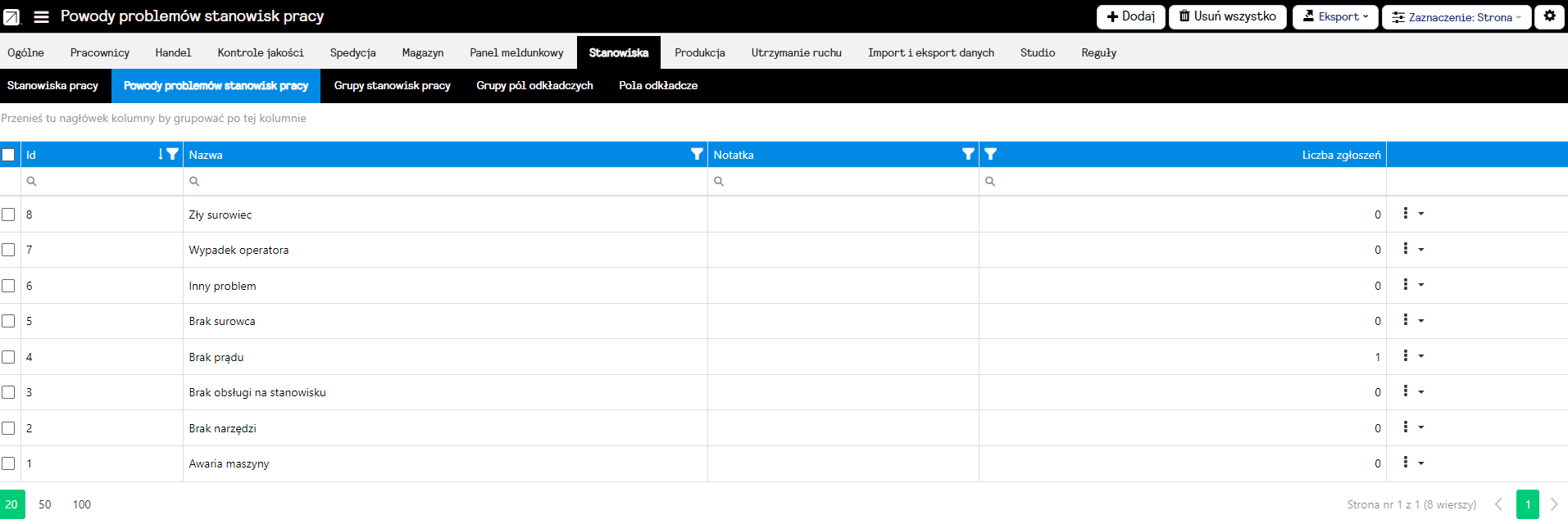 Po przejściu w zakładkę Powody problemów stanowisk pracy, pokaże się następujący widok: