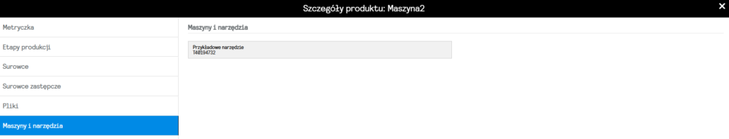 W widoku szczegółowym wybieramy zakładkę Maszyny i narzędzia, będą tam wskazane wszystkie urzadzenia z którymi powiązany został dany produkt
